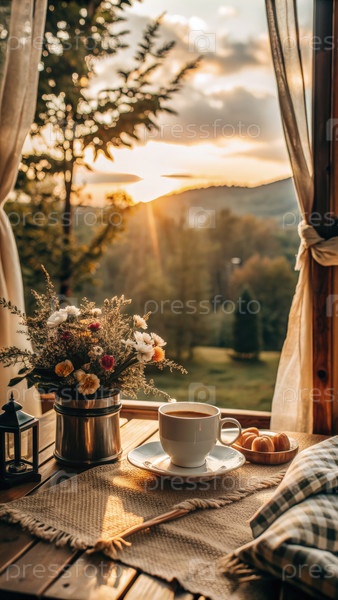 Уютный утренний кофе с горным видом и золотым солнечным светом