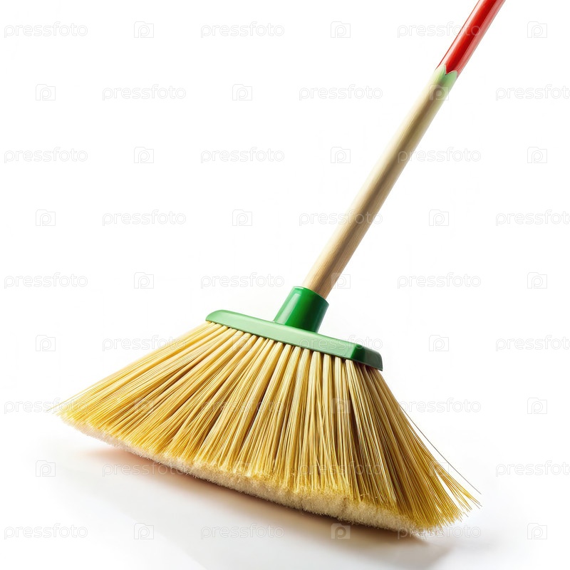 Зеленая и красная метла с деревянной ручкой на белом фоне