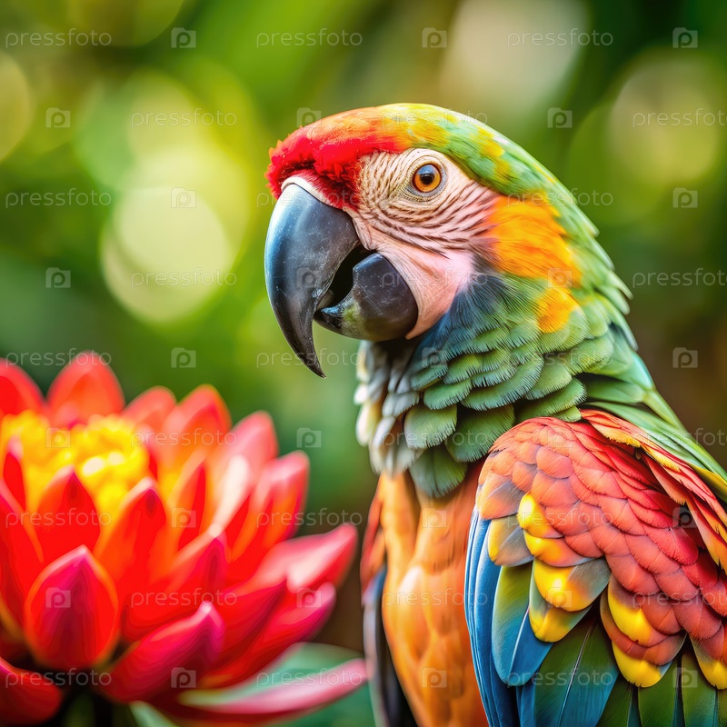 Близкий портрет яркого попугая мака, сидящего рядом с красным цветом