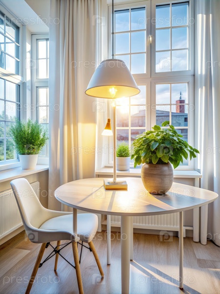 Белый стол и стул возле окна с естественным светом в стильной комнате