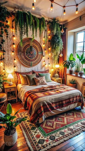 Уютная богемная спальня с теплым освещением и пышными растениями в солнечном пространстве