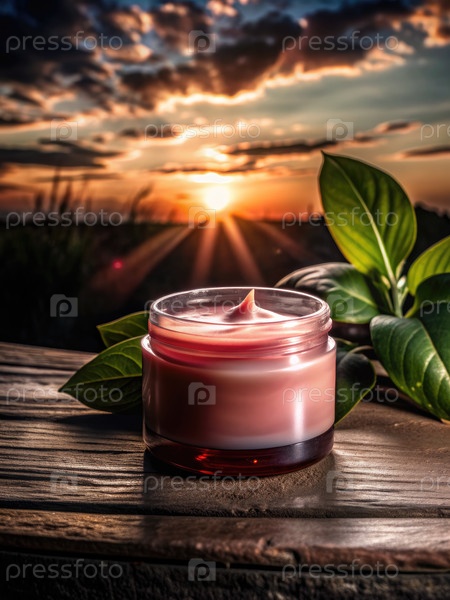 Красный крем на закате с зелеными листьями на деревянной поверхности