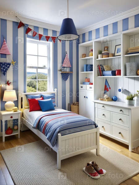 Спальня мальчика с тематикой мореплавания со стенами в голубых и белых полосах. генеративная ИИ
