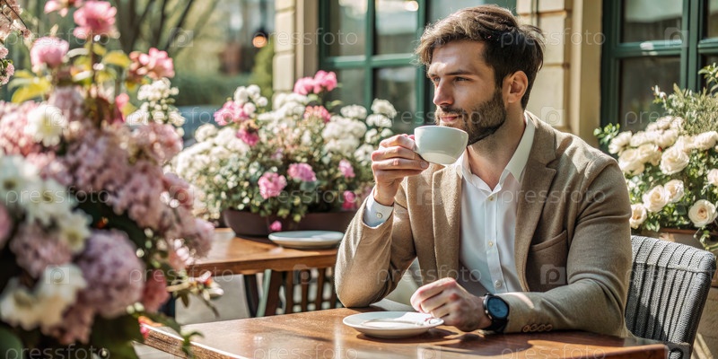 Мужчина наслаждается кофе в ресторане, окруженном цветущими цветами весной