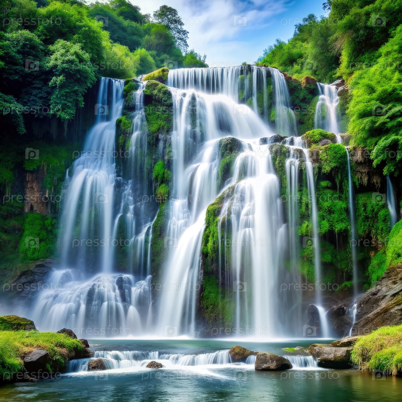 Спокойный водопад, каскадирующий сквозь пышные зеленые леса