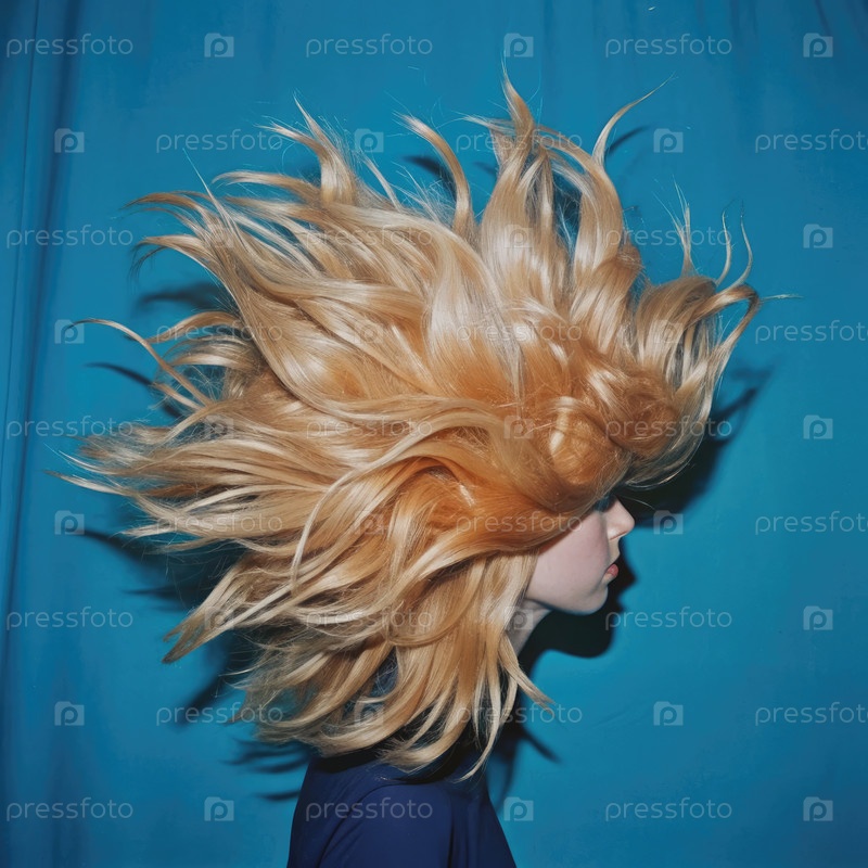 Женщина с хмурым оранжевым париком, волосы летают на ветре против голубой стены