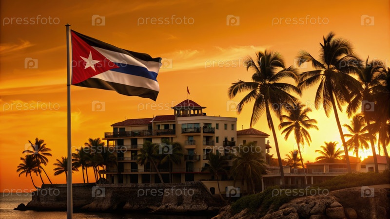 Яркий закат солнца над прибрежным курортом на Кубе с флагом среди пальмовых деревьев