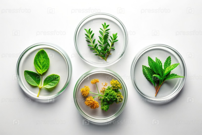 Исследование разнообразных видов растений в чашках Петри на белом фоне