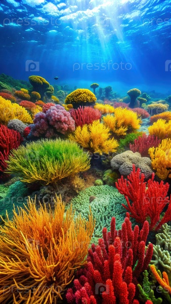 Живая экосистема коралловых рифов на морском дне с солнечными лучами