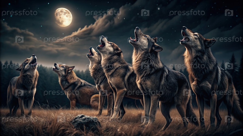 Волчьи стада выют под полнолунием в пропитанном дождем поле