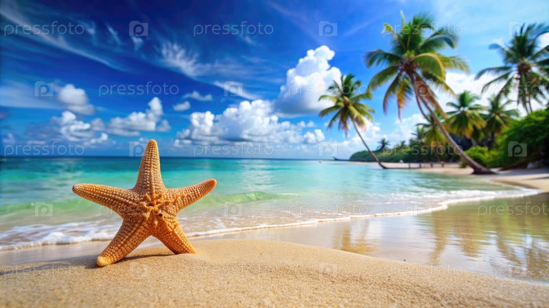 Морская звезда на тропическом пляже с пальмами и голубым небом