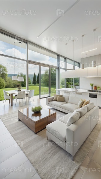 Белая кухня и гостиная с большими окнами и пышным зеленым видом