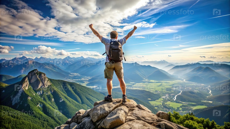 Счастливый турист достигает горной вершины с потрясающим видом на долину