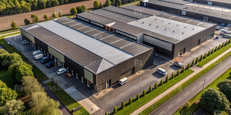 Вид с воздуха большого современного складского комплекса в пригородной обстановке
