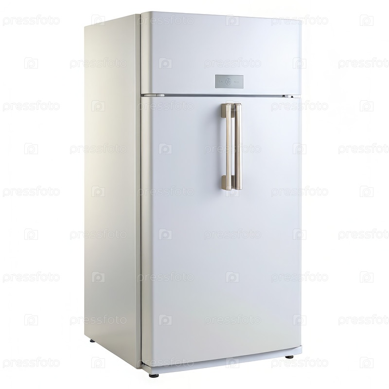 Белый двойной дверный холодильник с серебряным рукояткой на белом фоне