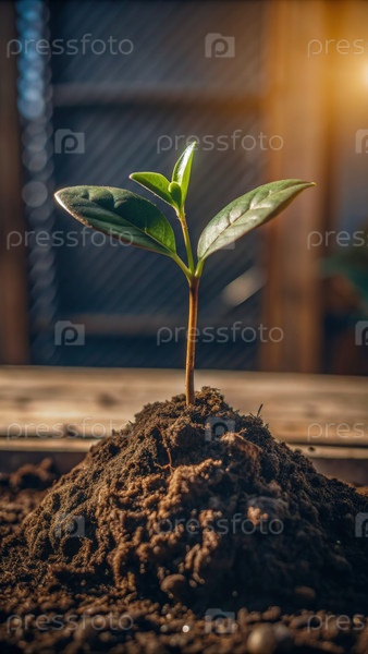 Молодое растение, выходящее из почвы с свежими листьями под естественным освещением