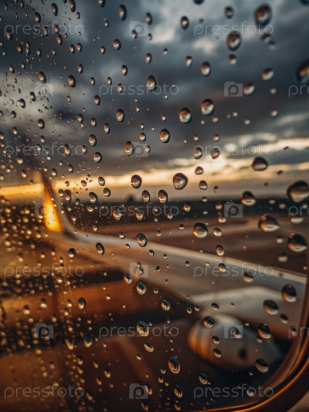 Капли дождя на окне самолета снимают потрясающий закат солнца над облаками во время позднего вечернего полета