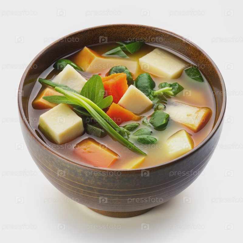 Чаша супа из мисо с тофу и овощами на белом фоне