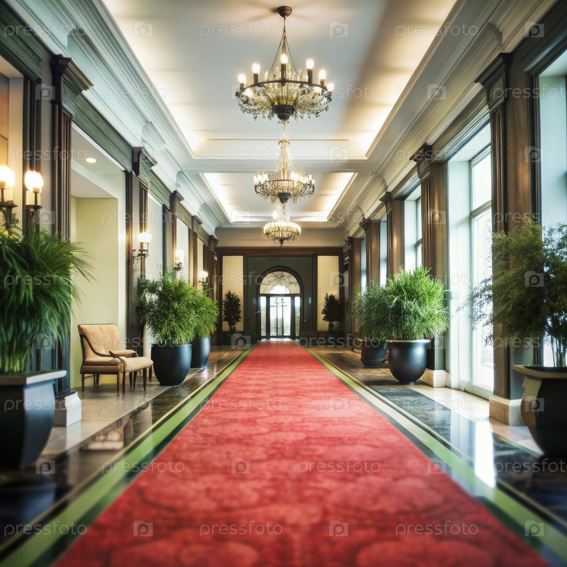 Элегантный гостиничный коридор с красной дорожкой и люстрами