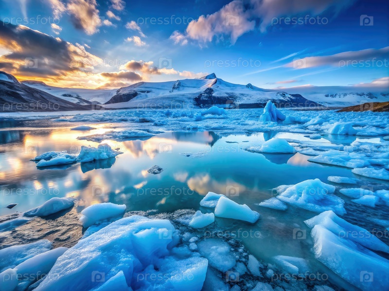 Голубые айсберги плавают в спокойном исландском озере на закате