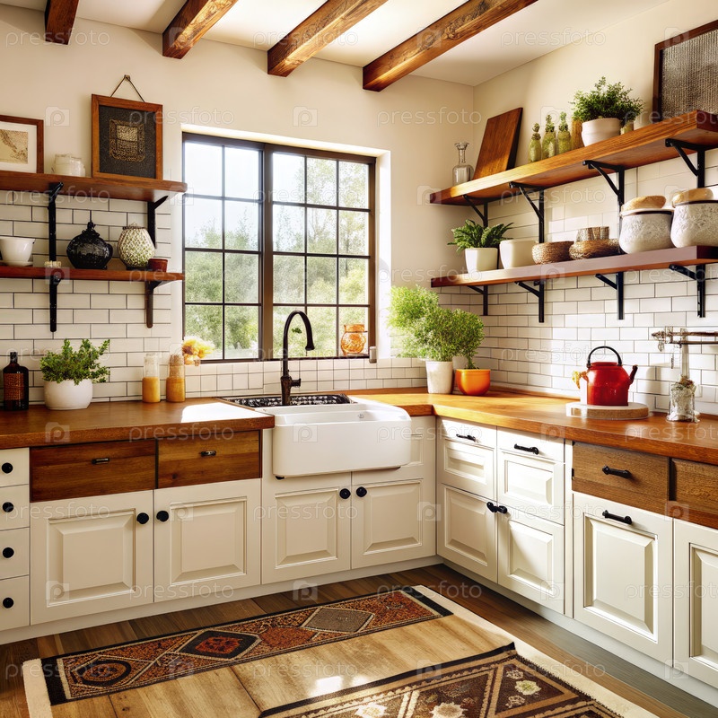 Рустическая кухня с естественным светом, освещающая стильные деревянные полки и белые шкафы