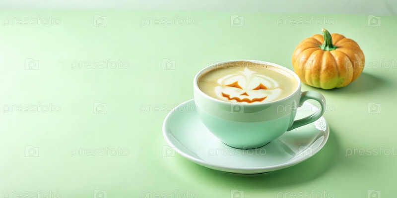 Тыквенное латте со специями с искусством пены Jack-o'-Lantern на зеленом фоне