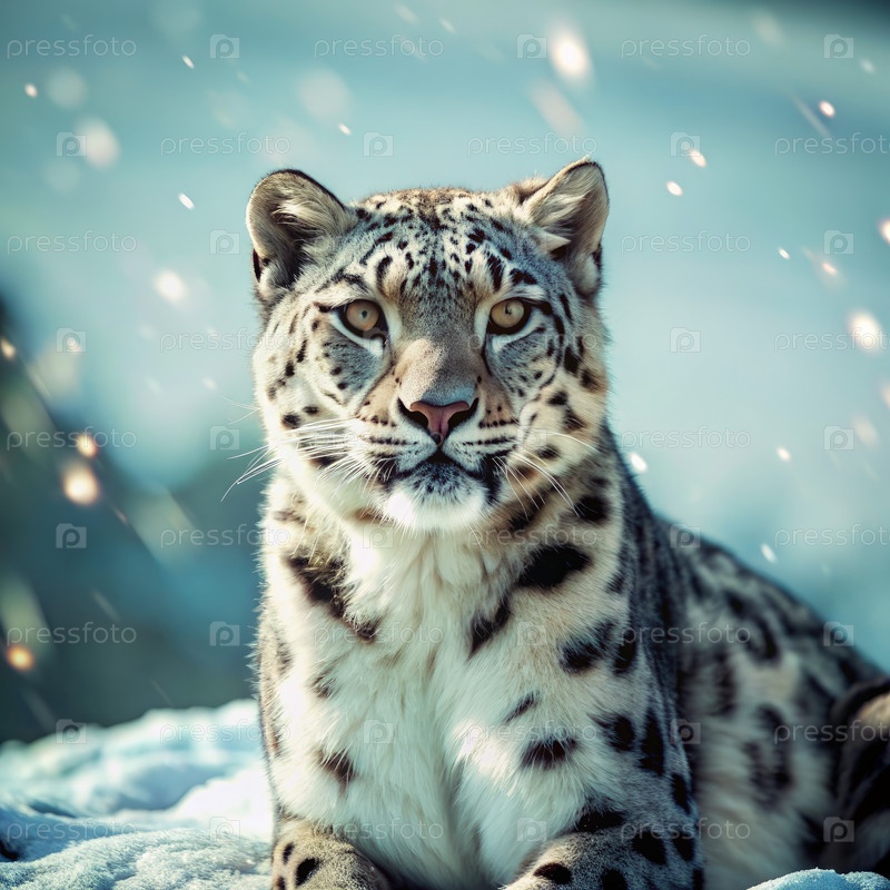 Величественный снежный леопард отдыхает в снежном горном пейзаже во время зимнего утреннего света