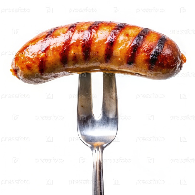 Горячая колбаса на длинной вилке готова к подаче на летний барбекю