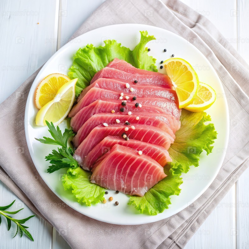 Свежее сашими с лимоном и латушкой на белой тарелке