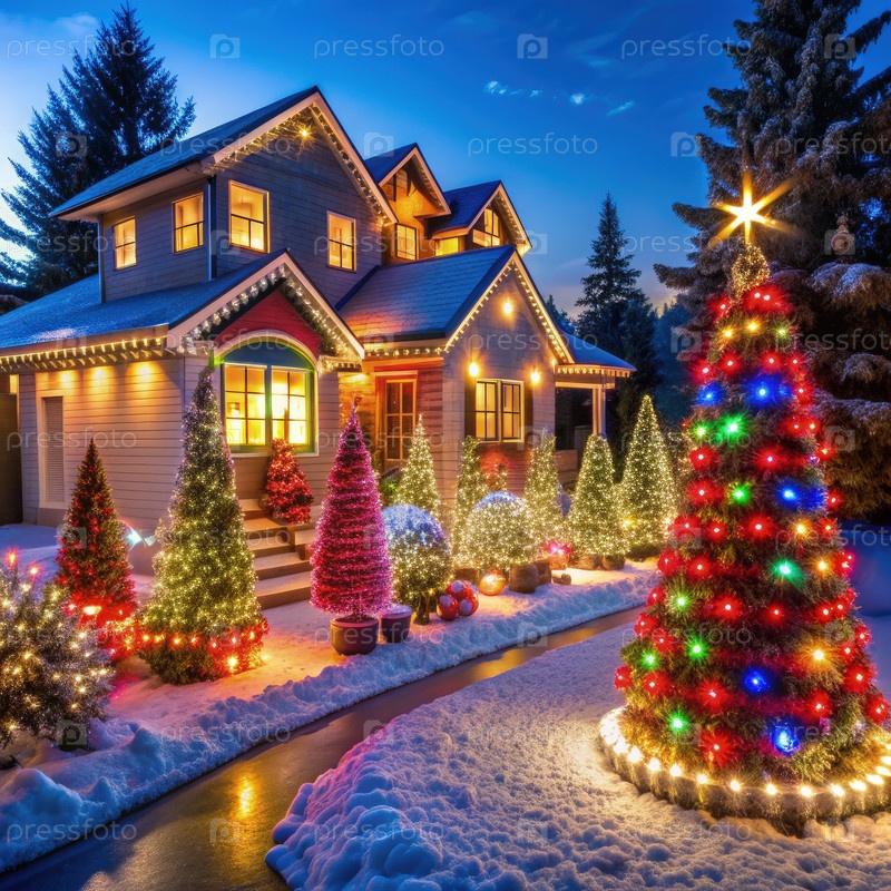 Праздничные рождественские огни украшают пригородный дом во время вечернего снегопада