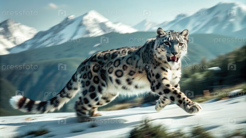 Снежный леопард грациозно бежит по величественному горному пейзажу под ярким небом