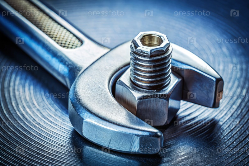 Ближайшее изображение ключа, захватывающего болт на металлической поверхности