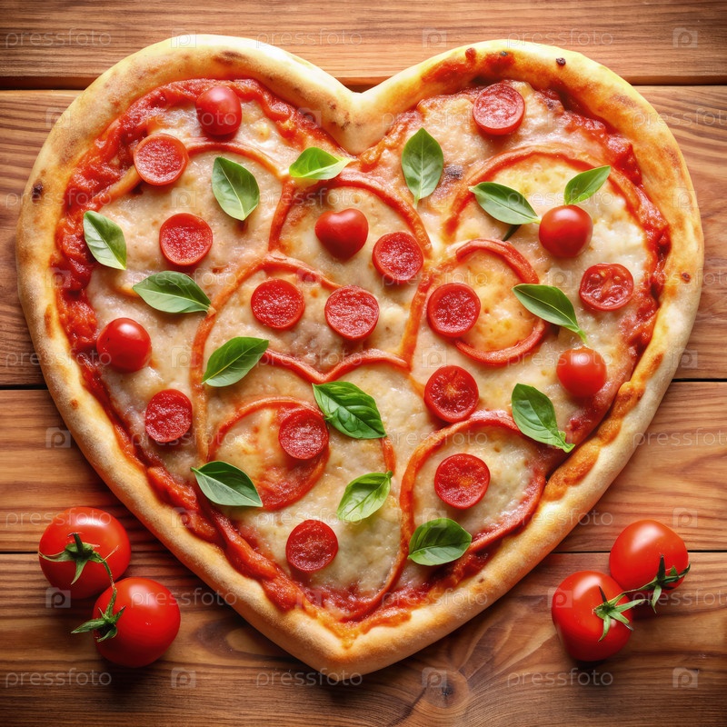 Пицца в форме сердца с помидором и базиликом на деревянном столе