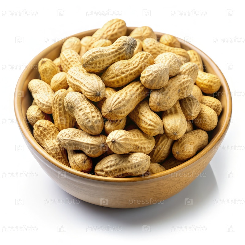 Чаша, наполненная неочищенными арахисами на ярко-белом фоне