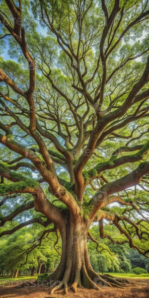 Великолепное дерево с обширным навесом в пышном зеленом парке