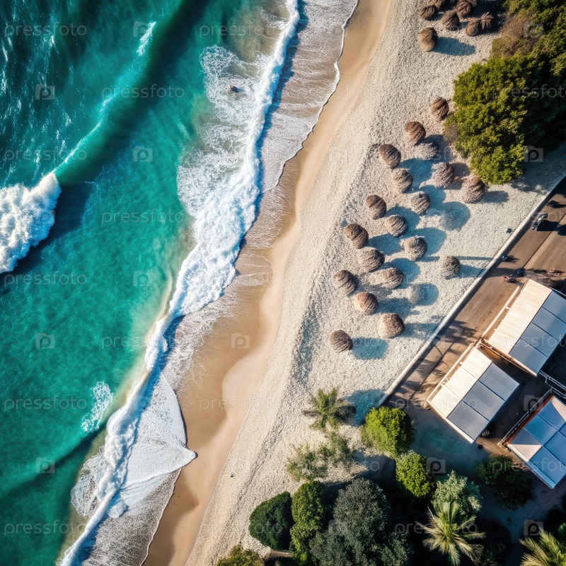Вид с воздуха на пустой пляж с бирюзовыми водами и зонтиками