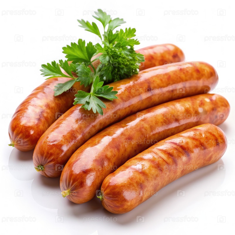 Ближайшее изображение четырех коричневых колбас с петрушкой на белом фоне