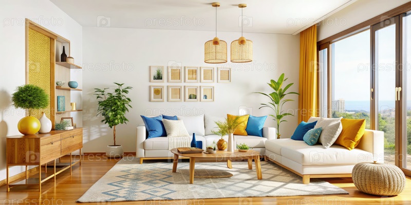 Бело-синяя гостиная с желтыми акцентами и видом на побережье