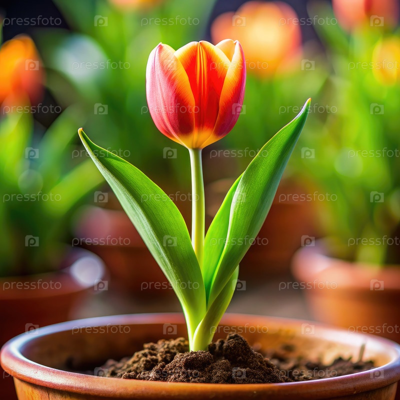 Одинокий цветок тюльпана в коричневом горшочке