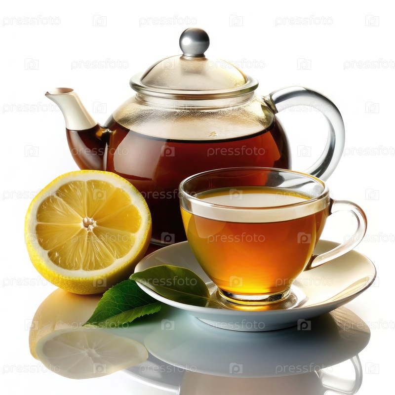 Стеклянный чайник и чашка чая с лимонным кусочком
