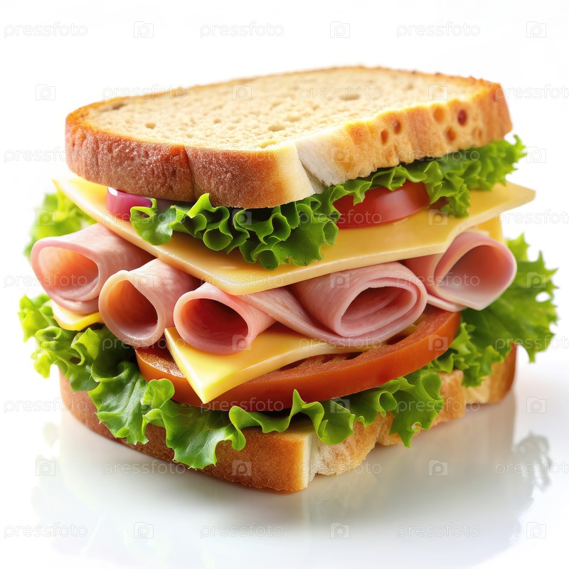 Ближайшее изображение бутерброда с ветчиной и сыром со салатами и помидорами на белом фоне