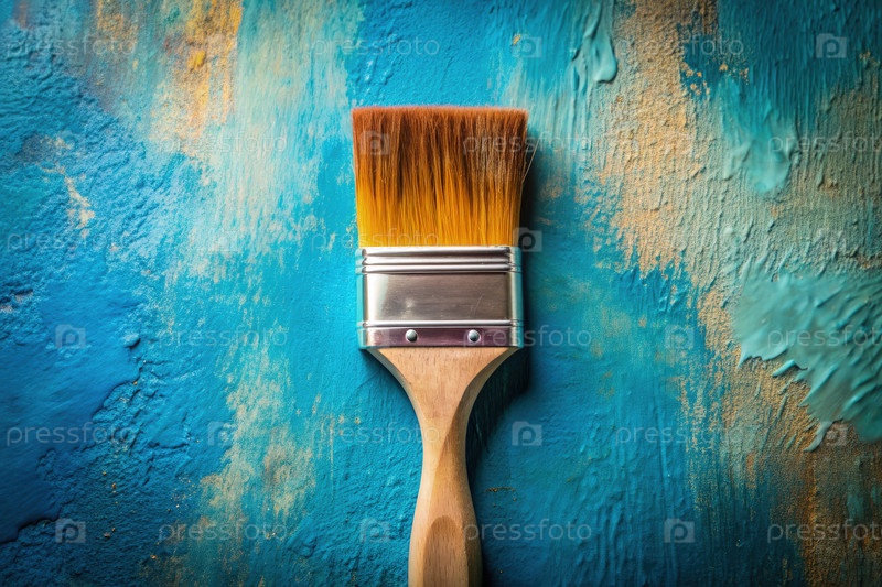 Живая кисть краски, отдыхающая на текстурированной поверхности ярко-синей стены. генеративный ИИ