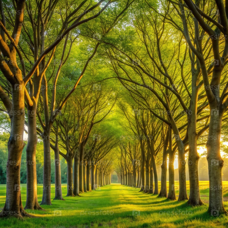 Солнечная роща деревьев, создающая естественную арку ранним утром