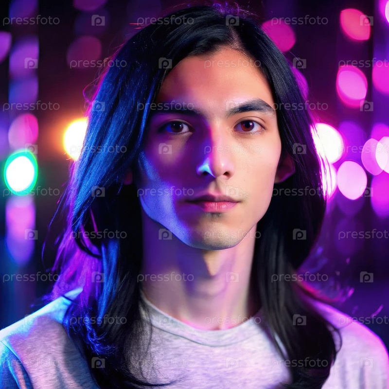 Футуристический портрет умного молодого небинарного индивидуума в цветной неоновой обстановке ночью