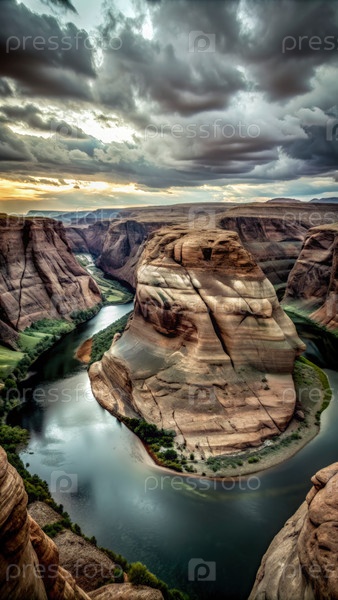 Вечерний свет отбрасывает тени над ландшафтом величественного каньона с витящейся рекой