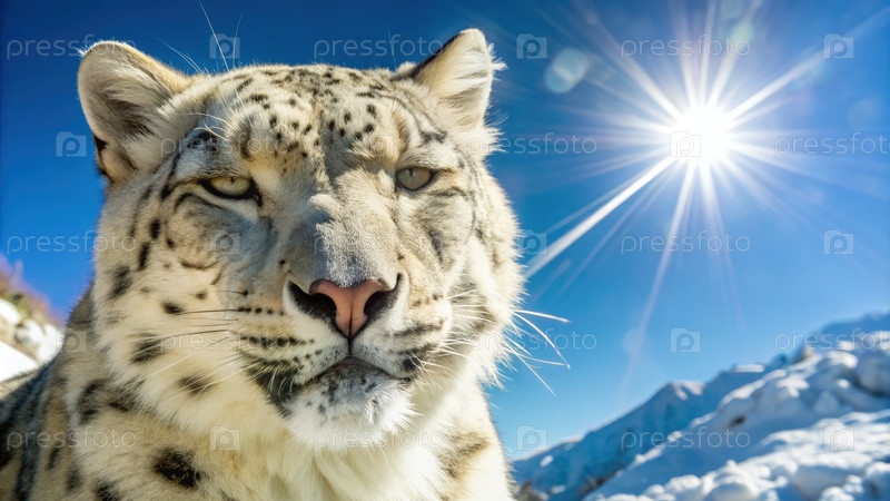 Снежный леопард сжимает глаза на ярком солнечном свете против белого снежного пейзажа