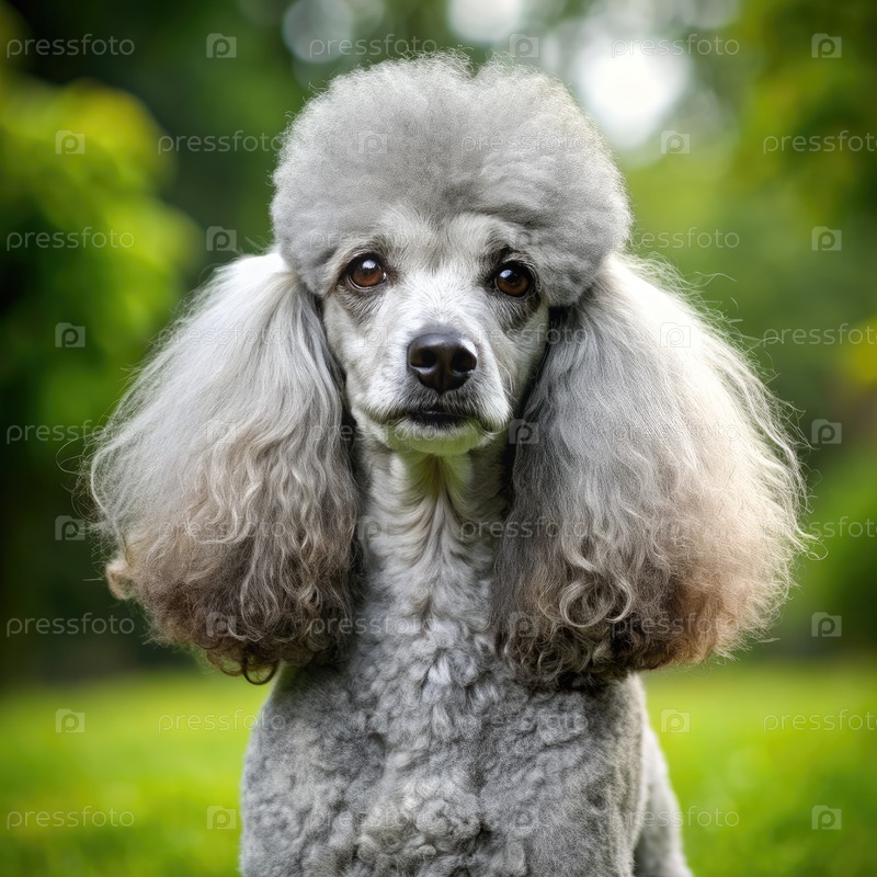 Серебряный стандарт пудель позирует в зеленой наружной обстановке