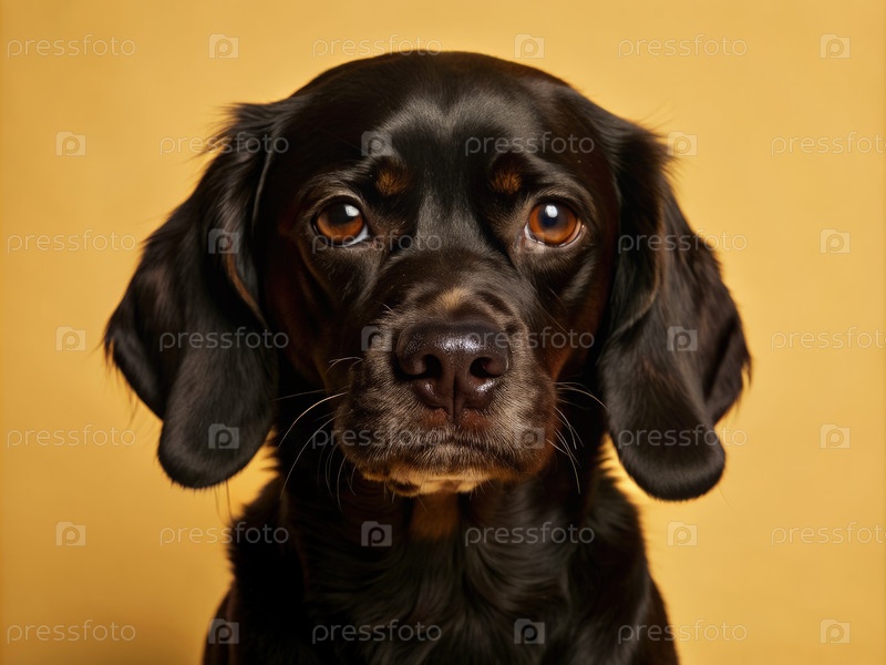 Плачущая собака с грустным выражением, захваченное на желтом фоне в простой студийной обстановке