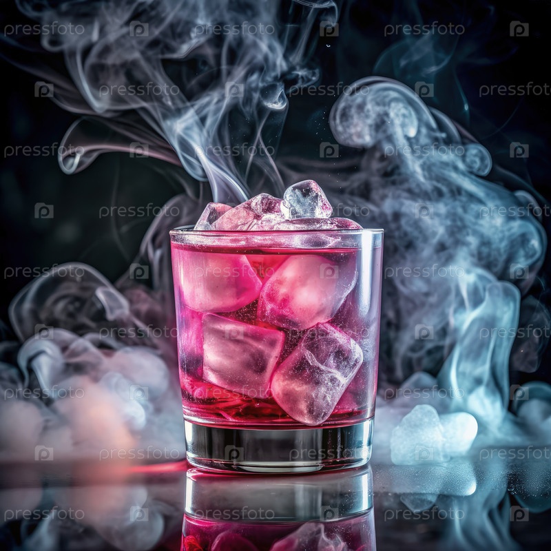 Стакан розовой жидкости с кубиками льда и дымом в темной обстановке