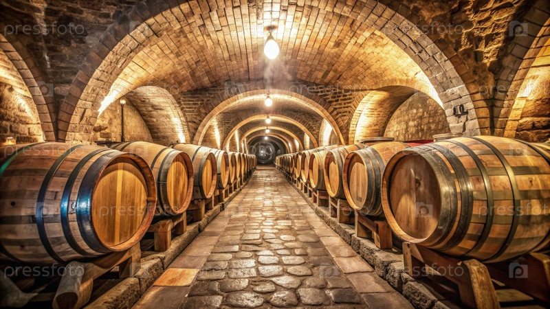 Ряд бочек с вином в подземном подвале